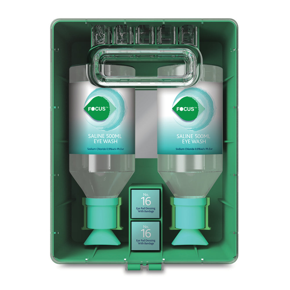 Robust eye wash station. Wipe clean, hardwearing, ABS plastic. Luminous, printed instructions. Bottle includes integral eye bath.